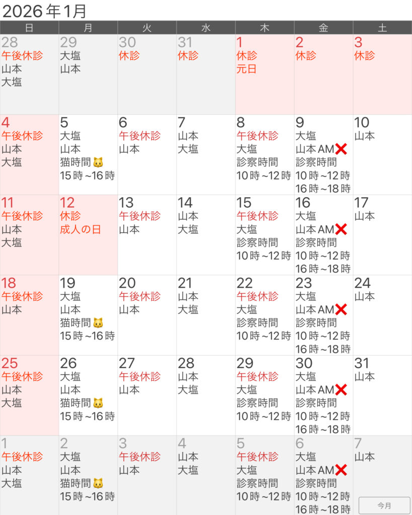 ※火曜日15:00~16:00は猫時間(猫ちゃんだけの診察時間)
